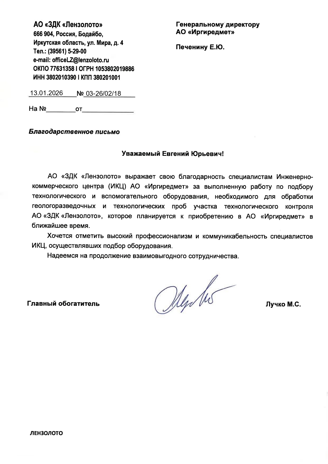 Благодарственное письмо от АО "ЗДК "Лензолото"" за подбор технологического и вспомогательного оборудования