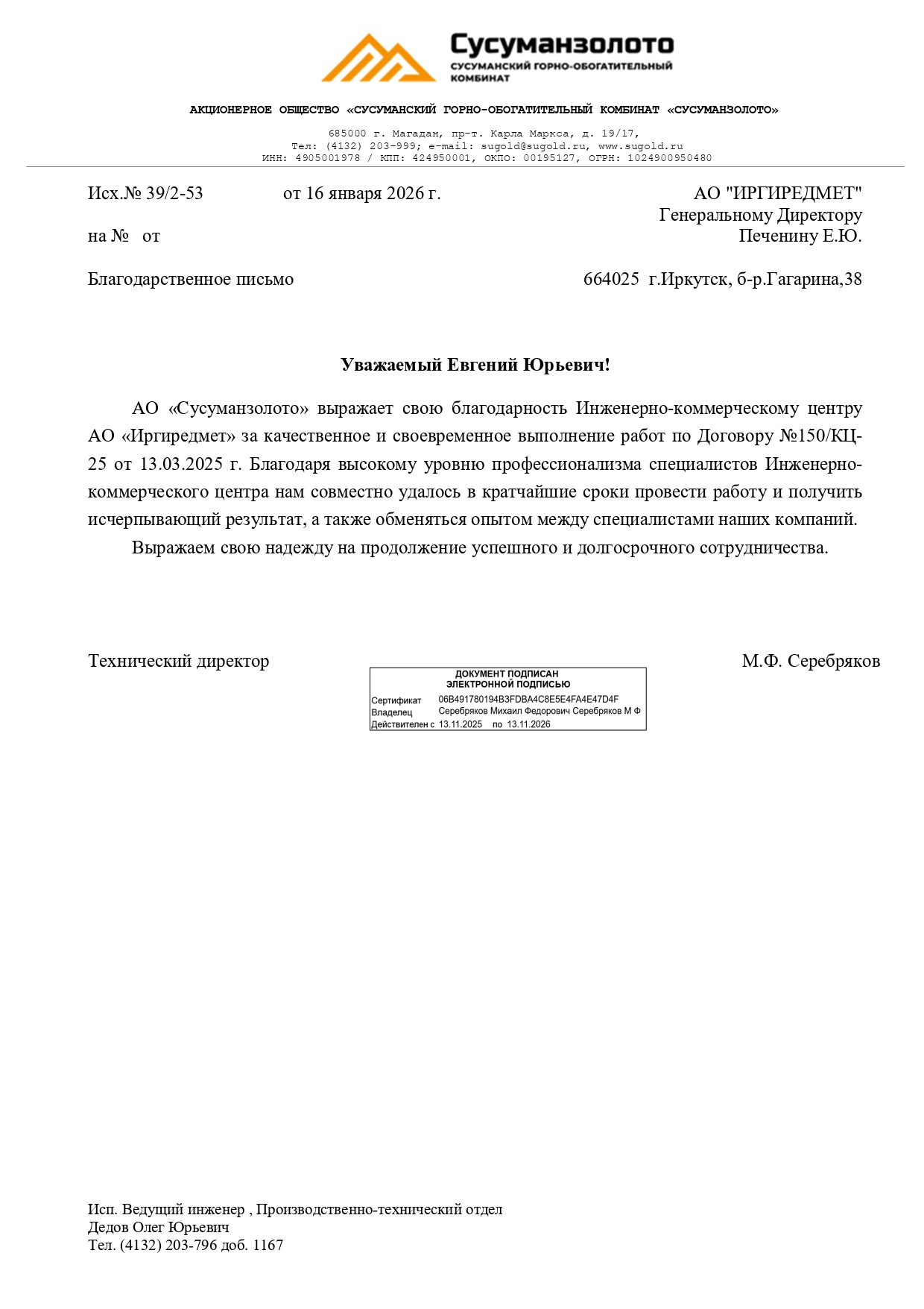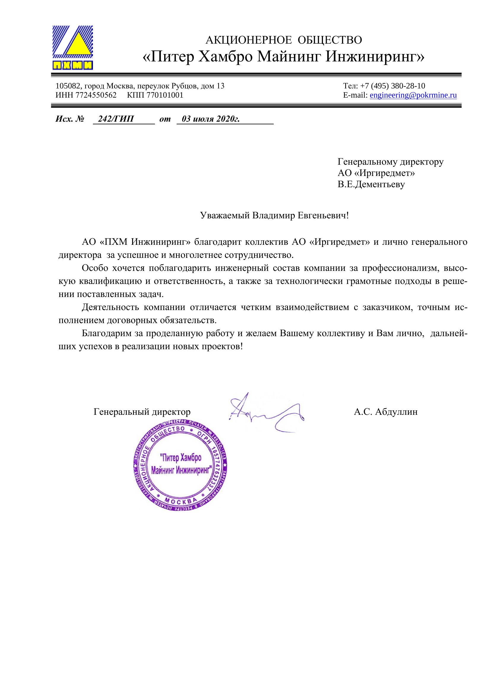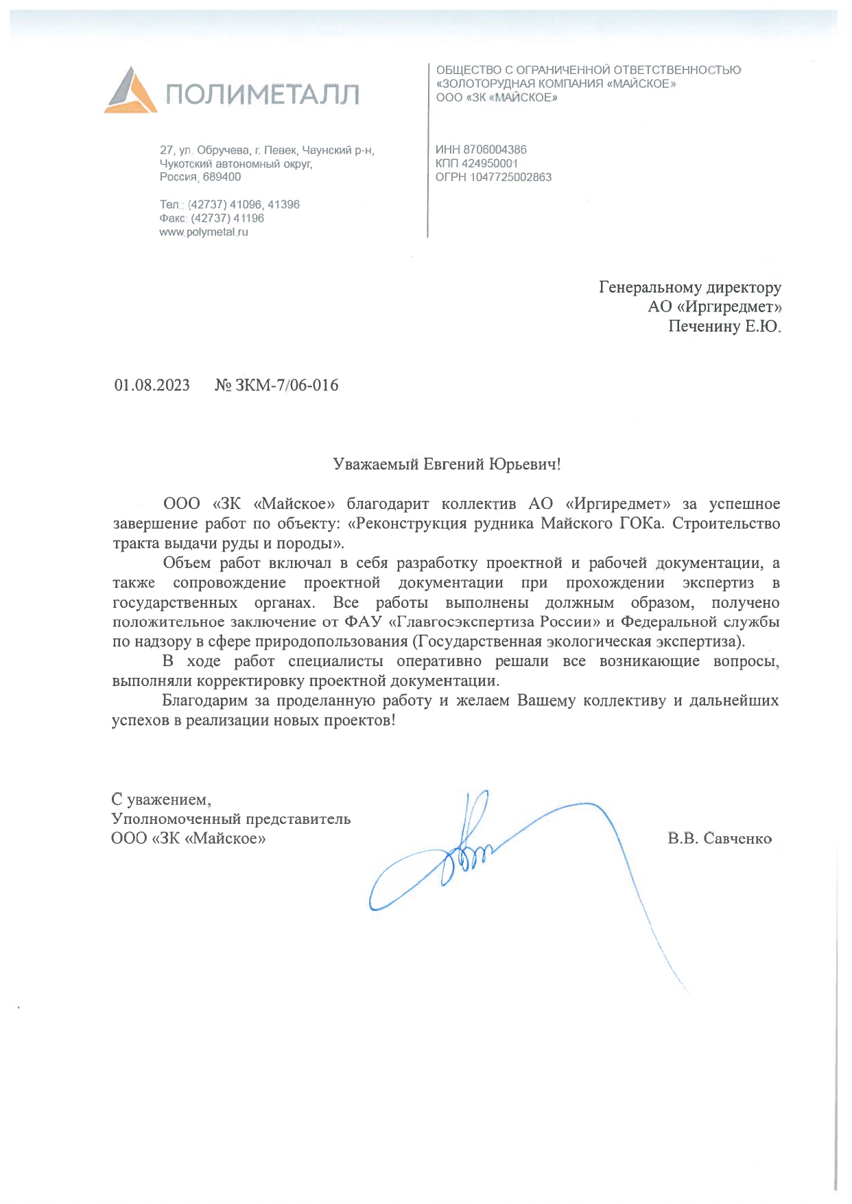 Благодарность Иргиредмету от АО "Полиметалл инжиниринг" за профессионализм в авторском надзоре на объекте ГДП "Пещерное"