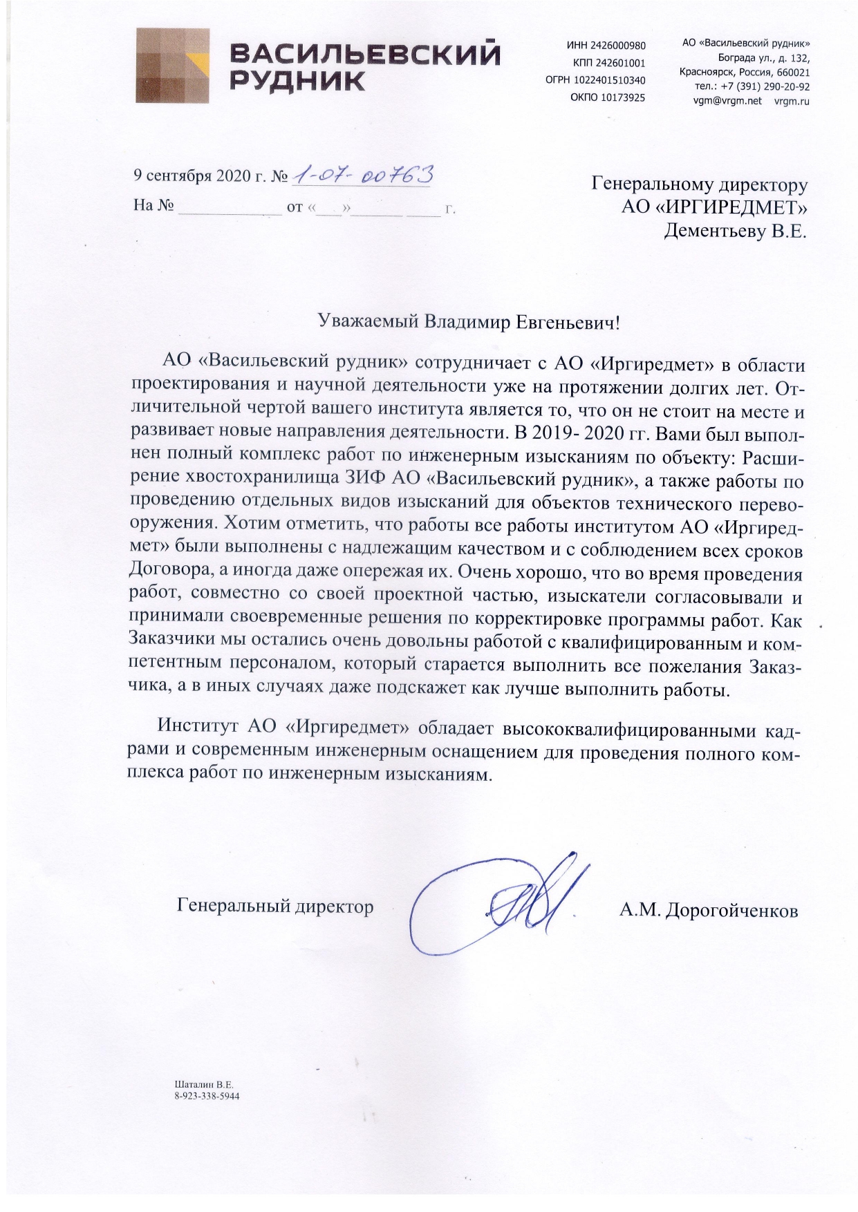 Благодарность от АО "Васильевский рудник" за работы по техсопровождению строительно-монтажных работ по реконструкции золотоизвлекательной фабрики и строительные работы по реконструкции хвостохранилища