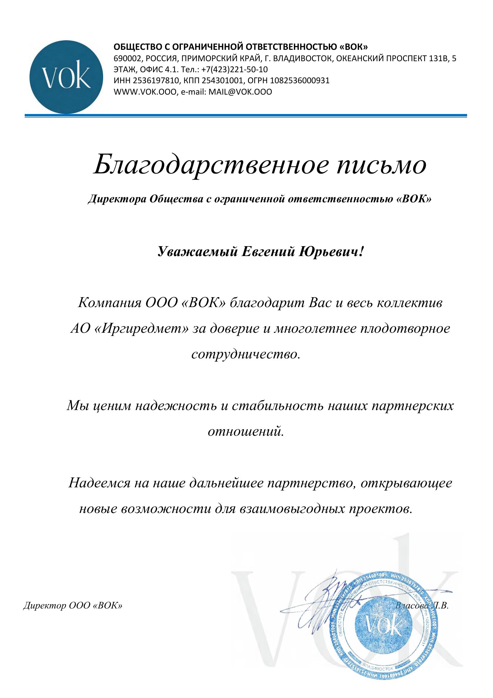 Благодарность от ООО "ВОК" за доверие и многолетнее плодотворное сотрудничество