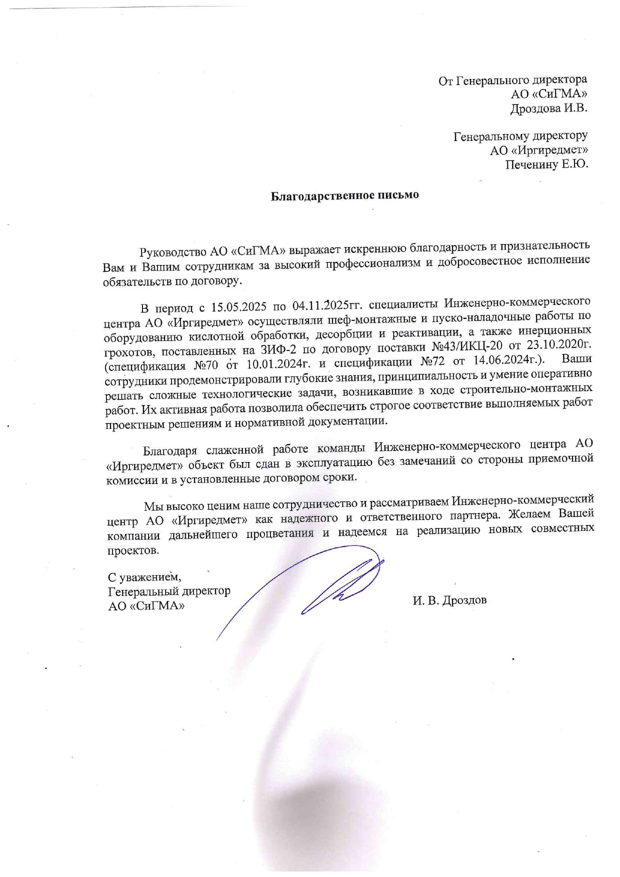 Благодарность от АО "СиГМА" за шеф-монтажные и пуско-наладочные работы по оборудованию кислотной обработки, десорбции и реактивации, а также инерционных грохотов