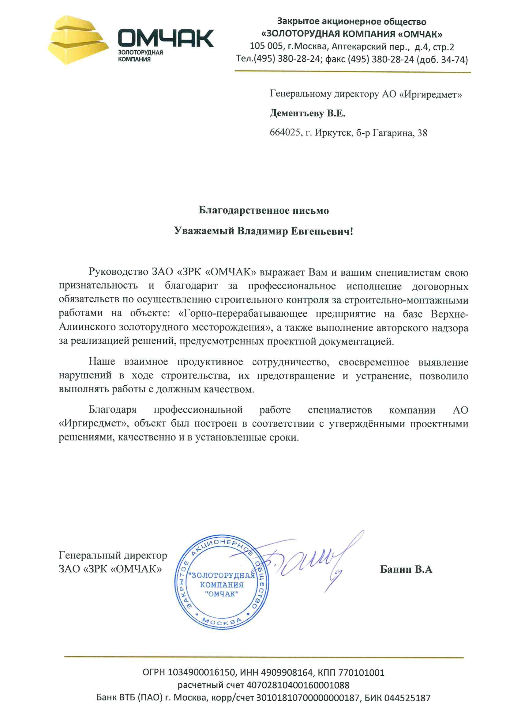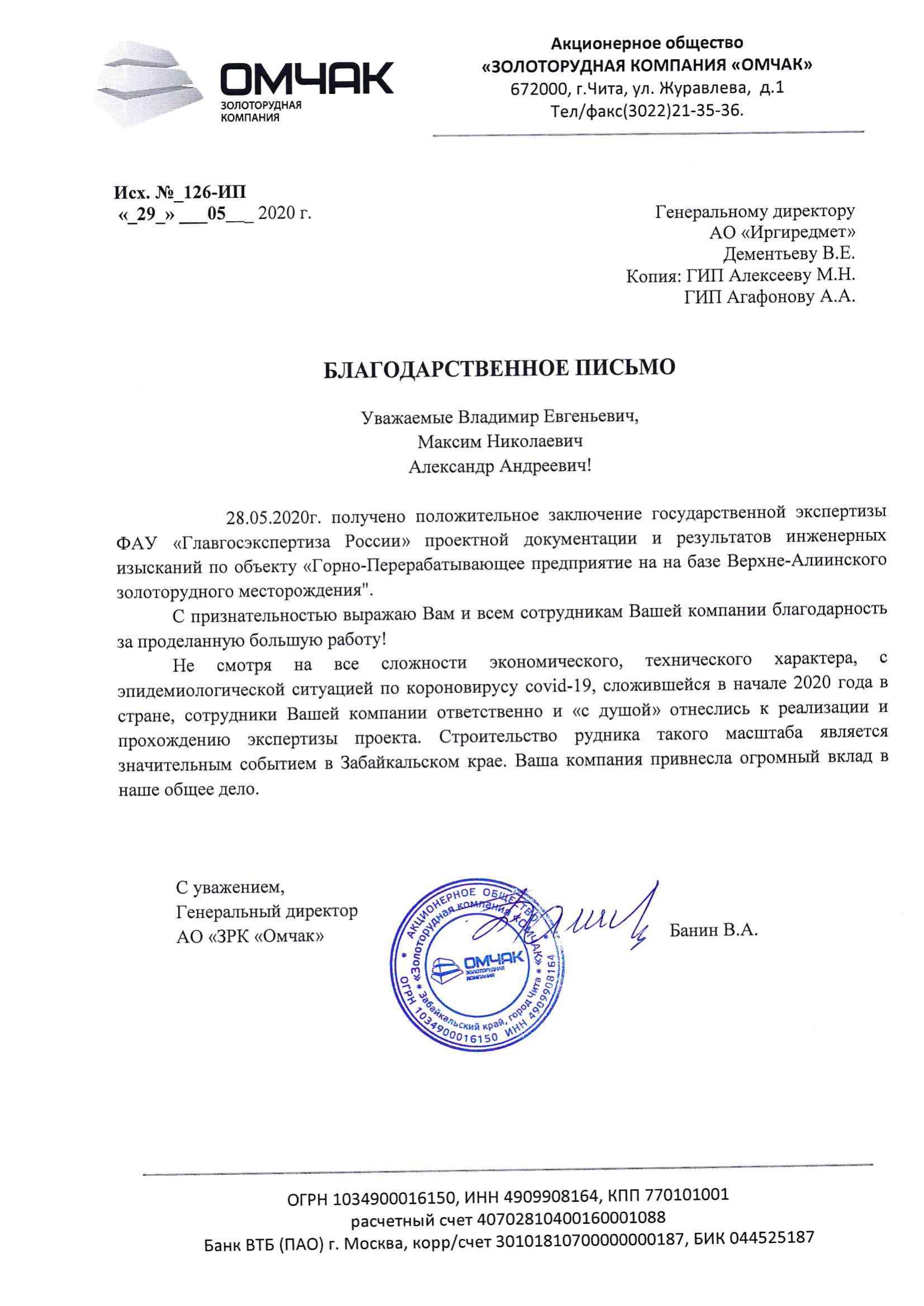 Благодарность от золоторудной компании "ОМЧАК" за строительный контроль за строительно-монтажными работами на горно-перерабатывающем предприятии на базе Верхне-Алиинского золоторудного месторождения
