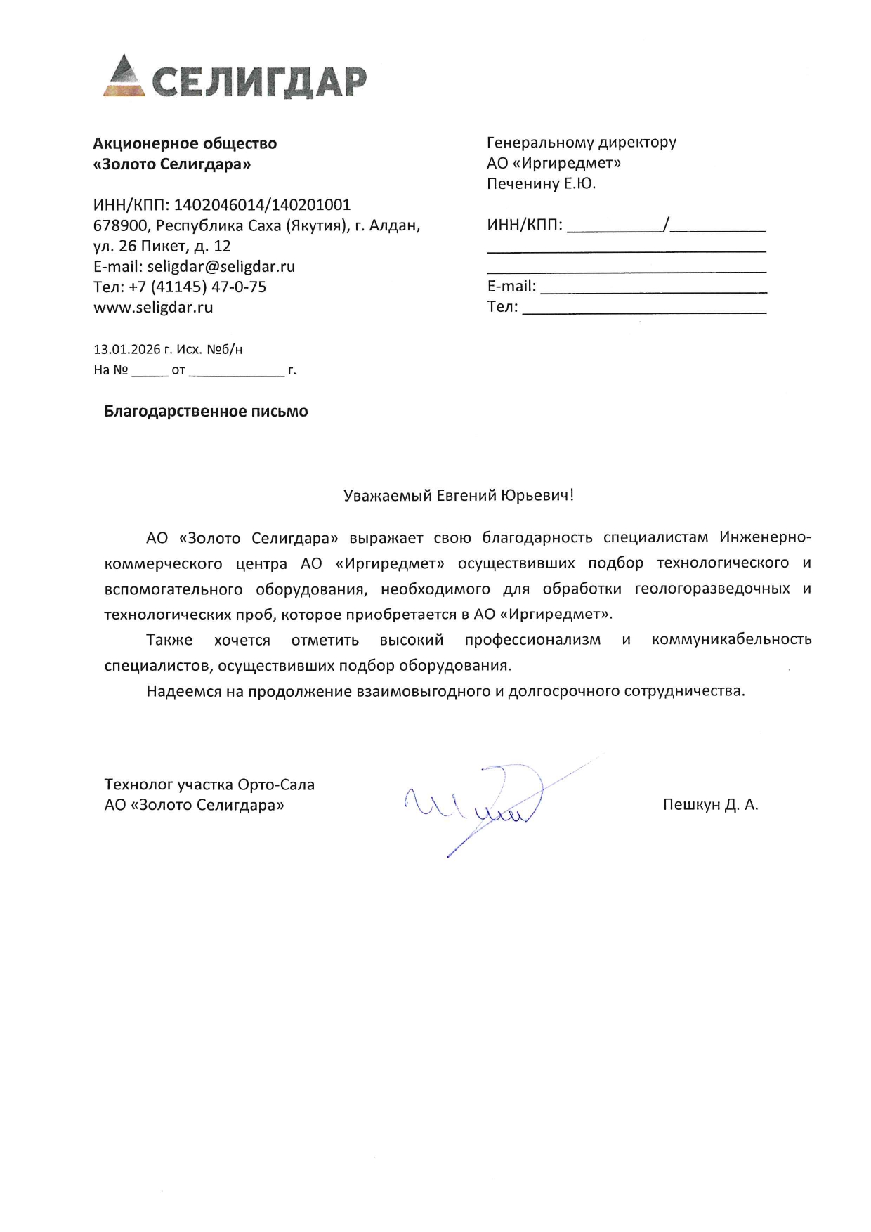 Благодарность Иргиредмету от АО "Полиметалл инжиниринг" - компетентному исполнителю в сфере ведения авторского надзора на объекте "Нежданинское"