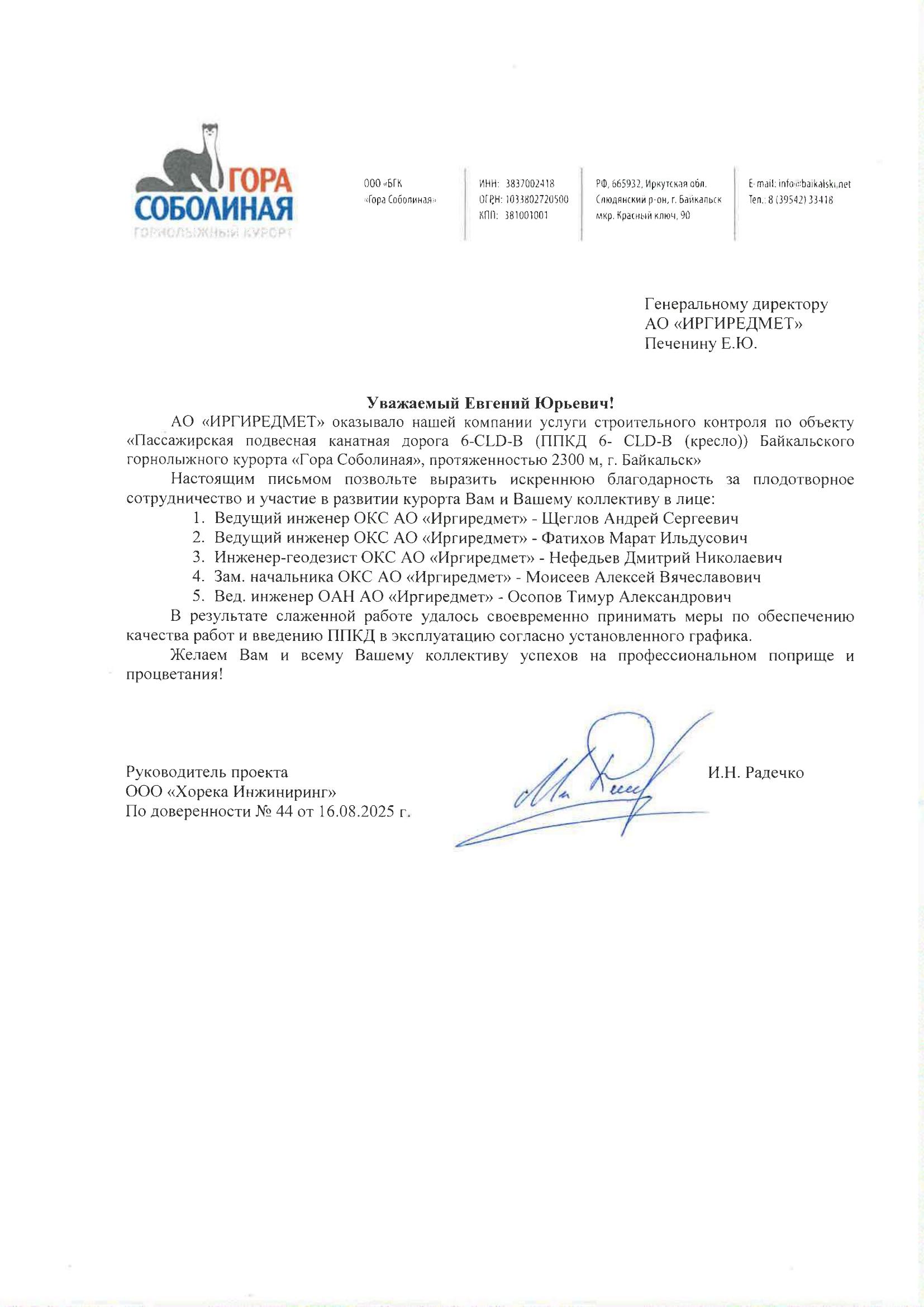 Благодарность от ООО "БГК "Гора Соболиная"" за строительный контроль по объекту "Пассажирская подвесная канатная дорога"