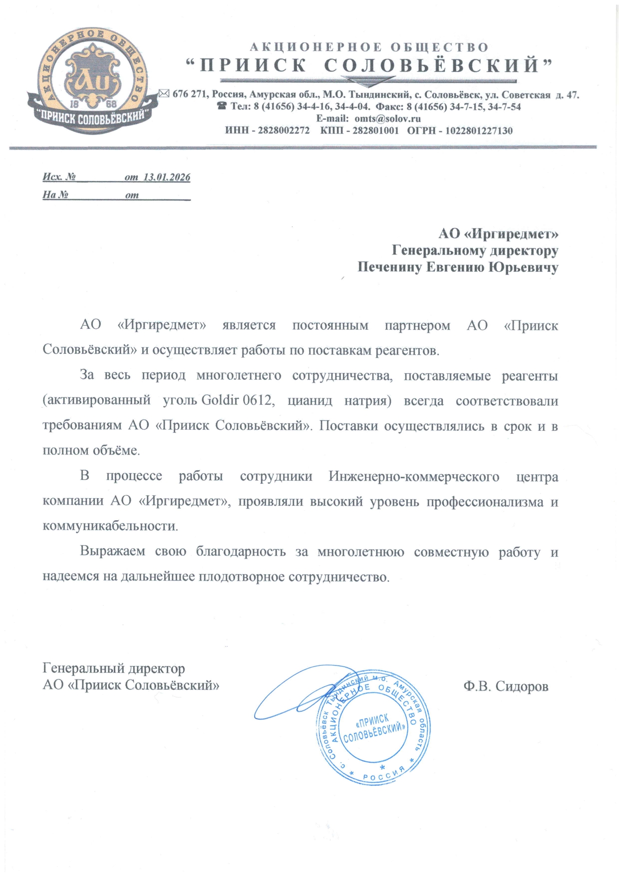 Благодарность от АО "Прииск Соловьевский" за многолетнее успешное сотрудничество