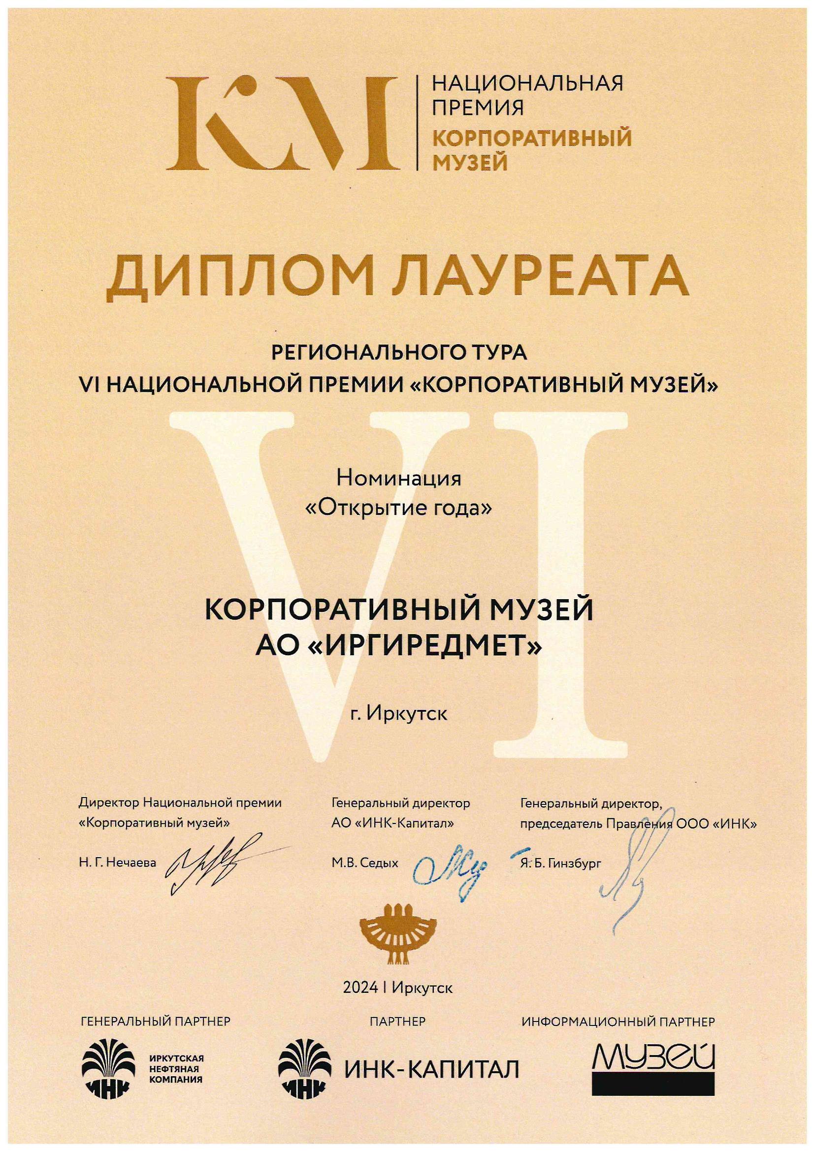 Диплом лауреата регионального тура VI Национальной премии «Корпоративный музей» АО "Иргиредмет"