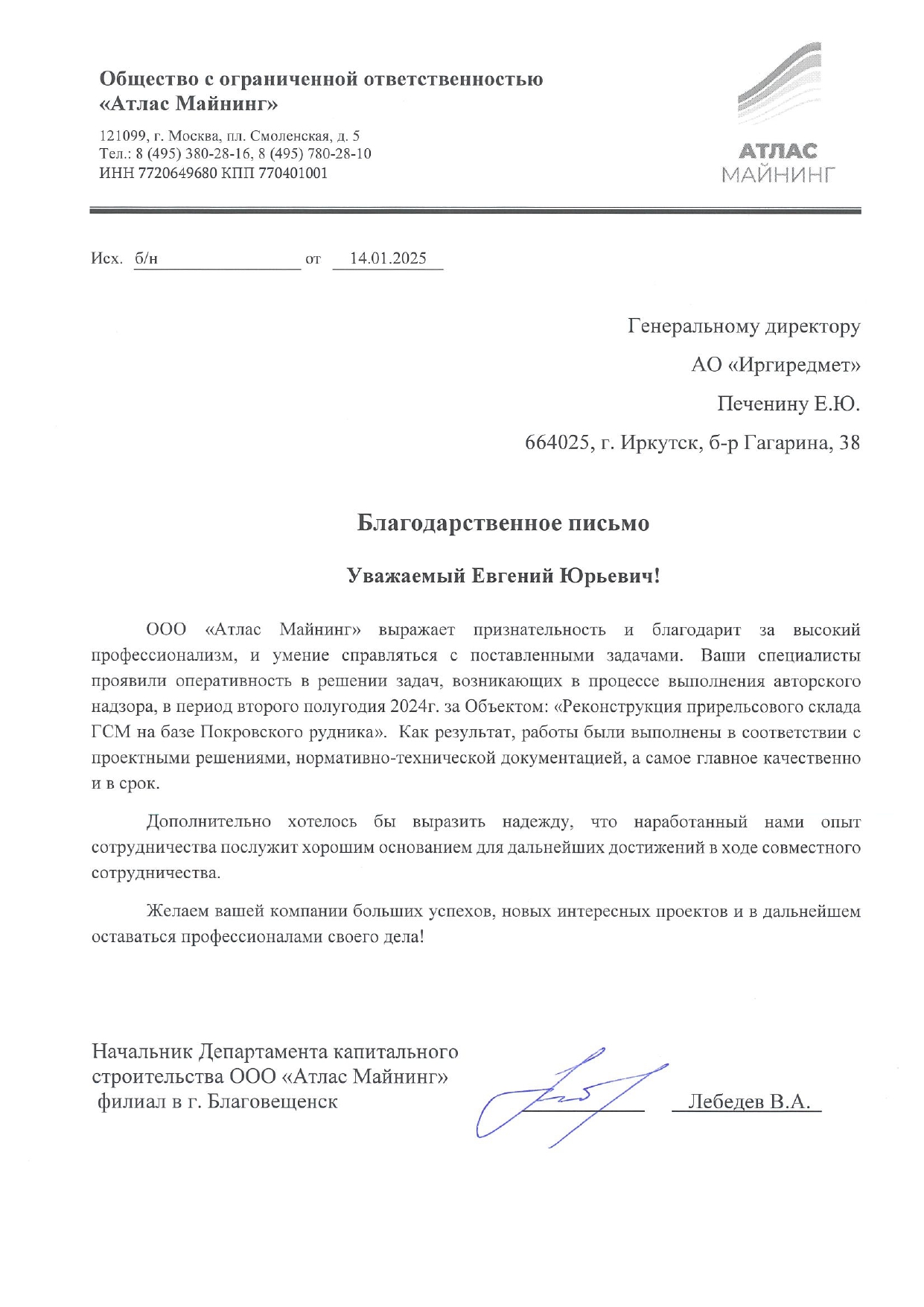 Благодарность от ООО "Атлас Майнинг" за профессиональное выполнение авторского надзора за объектом "Реконструкция прирельсового склада ГСМ на базе Покровского рудника"